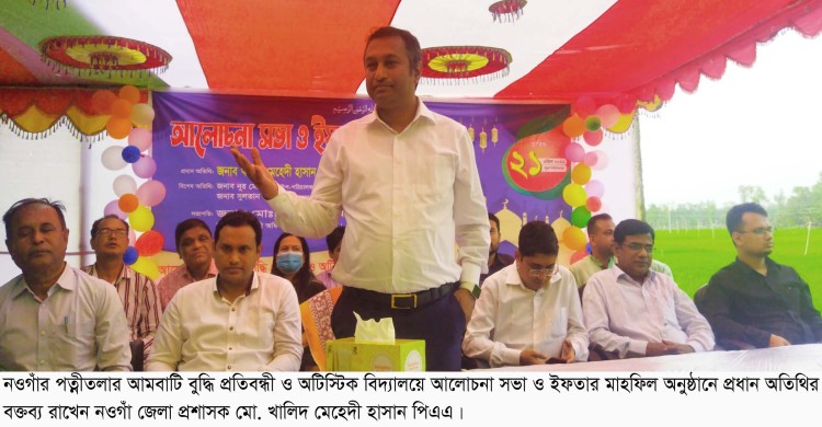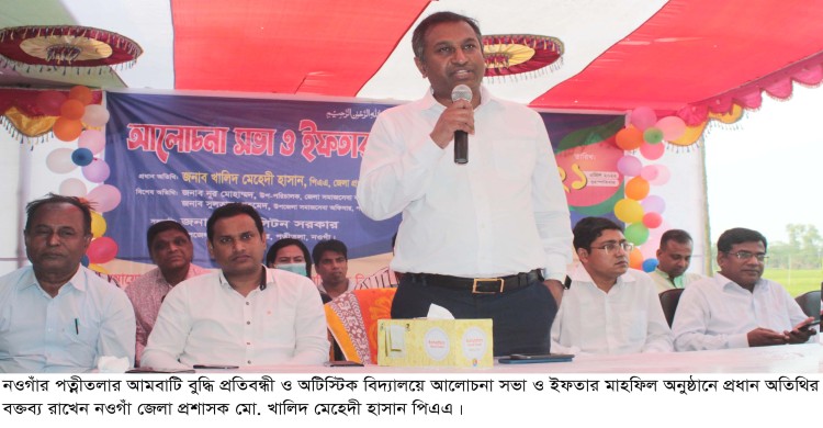 নওগাঁর ধামইরহাট উপজেলার পার্শ্ববর্তী আমবাটি বুদ্ধি প্রতিবন্ধী ও অটিস্টিক বিদ্যালয়ে আলোচনা সভা ও ইফতার মাহফিল অনুষ্ঠিত হয়েছে। ২১ এপ্রিল বিকেল সাড়ে ৩ টায় পত্নীতলা উপজেলা নির্বাহী অফিসার লিটন সরকারের সভাপতিত্বে আলোচনা সভায় প্রধান অতিথির বক্তব্য নওগাঁ জেলা প্রশাসক মো. খালিদ মেহেদী হাসান পিএএ বলেন,‘ প্রতিবন্ধীরা সমাজের বোঝা নয়, উপযুক্ত শিক্ষা ও প্রশিক্ষণে তারা হতে পারে সম্পদ।’এ সময় জেলা প্রশাসক আমবাদি বুদ্ধি প্রতিবন্ধী ও অটিস্টিক বিদ্যালয় পরিদর্শন করে সন্তোষ প্রকাশ করেন এবং সার্বিক সহযোগিতার আশ্বাস প্রদান কনে। অনুষ্ঠানে নওগাঁ জেলা সমাজসেবা অধিদপ্তরের উপ-পরিচালক নুর মোহাম্মদ, পত্নীতলার সহকারী কমিশনার (ভূমি) রাশেদুল ইসলাম, পত্নীতলা উপজেলা ভাইস চেয়ারম্যান খাদিজাতুল কোবরা মুক্তা, সমাজসেবা অফিসার সুলতান আহমেদ, মহিলা বিষয়ক অফিসার মনোরঞ্জন পাল, একাডেমিক সুপার ভাইজার মোর্শেদুল আলম,ইউপি চেয়ারম্যান ছবেদুল ইসলাম রনি, জেলা প্রতিবন্ধী বিষয়ক কর্মকর্তা হুমায়ন কবির, প্রধান শিক্ষক আখি আকতার, প্রতিবন্ধী শিক্ষার্থী তাসলিমা খাতুন, সিনিয়র সাংবাদিক এম এ মালেক, উপজেলা প্রেস ক্লাব সভাপতি আবু মুছা স্বপন প্রমুখ উপস্থিত ছিলেন।