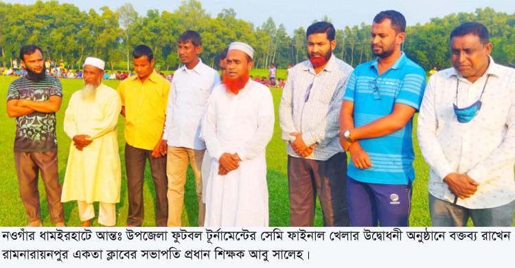নওগাঁর ধামইরহাটে আন্তঃউপজেলা ফুটবল টূর্নামেন্টের সেমিফাইনাল খেলার উদ্বোধন করা হয়েছে। রামনারায়নপুর একতা ক্লাবের উদ্যোগে ২৫ অক্টোবর বিকেল ৪ রামনারায়নপুর ফুটবল মাঠে সেমিফাইনাল খেলার উদ্বোধন করেন রাম নারায়নপুর একতা ক্লাবের সভাপতি প্রধান শিক্ষক আবু সালেহ ও পৌরসভার প্যানেল মেয়র মেহেদী হাসান। কানায় কানায় পরিপূর্ণ দর্শকদের মন মাতানো খেলা উপহার দেন ধামইরহাট পৌরসভা বনাম চিরিপাড়ের যুব সমাজ একাদ্বশ। খেলায় ট্রাইবেকারে ৪-৫ গোলে চিরিপাড়ের যুব সমাজ একাদ্বশ ফাইনালে উঠেন। খুবই শ্রীঘ্রই জাকজমক পূর্ণভাবে অনুষ্ঠিতব্য ফাইনাল খেলায় সাহাপার বরেন্দ্র ক্লাবের সাথে চুড়ান্ত প্রতিযোগিতায় লড়বেন চিড়িপাড়ের যুব সমাজ ফুটবল টিম। ধামইরহাট পৌরসভার প্যানেল মেয়র মুক্তাদিরুল হক মুক্তা, পত্নীতলা উপজেলার পাটিচরা ইউপি চেয়ারম্যান রায়হানুল আলম, ধামইরহাট উপজেলা ক্রীড়া সংস্থার সম্পাদক ও সরকারি এম এম কলেজের প্রভাষক মিনহাজুল হক সরকার শিবলী, উপজেলা প্রেস ক্লাব সভাপতি আবু মুছা স্বপন, সাংবাদিক সুফল রায়, উপজেলা ফুটবল ফেডারেশনের সভাপতি নাসির মাহমুদ, ক্রীড়াপ্রেমী উপসহকারী কৃষি কর্মকর্তা ফারুক হোসেন প্রমুখ উপস্থিত ছিলেন।